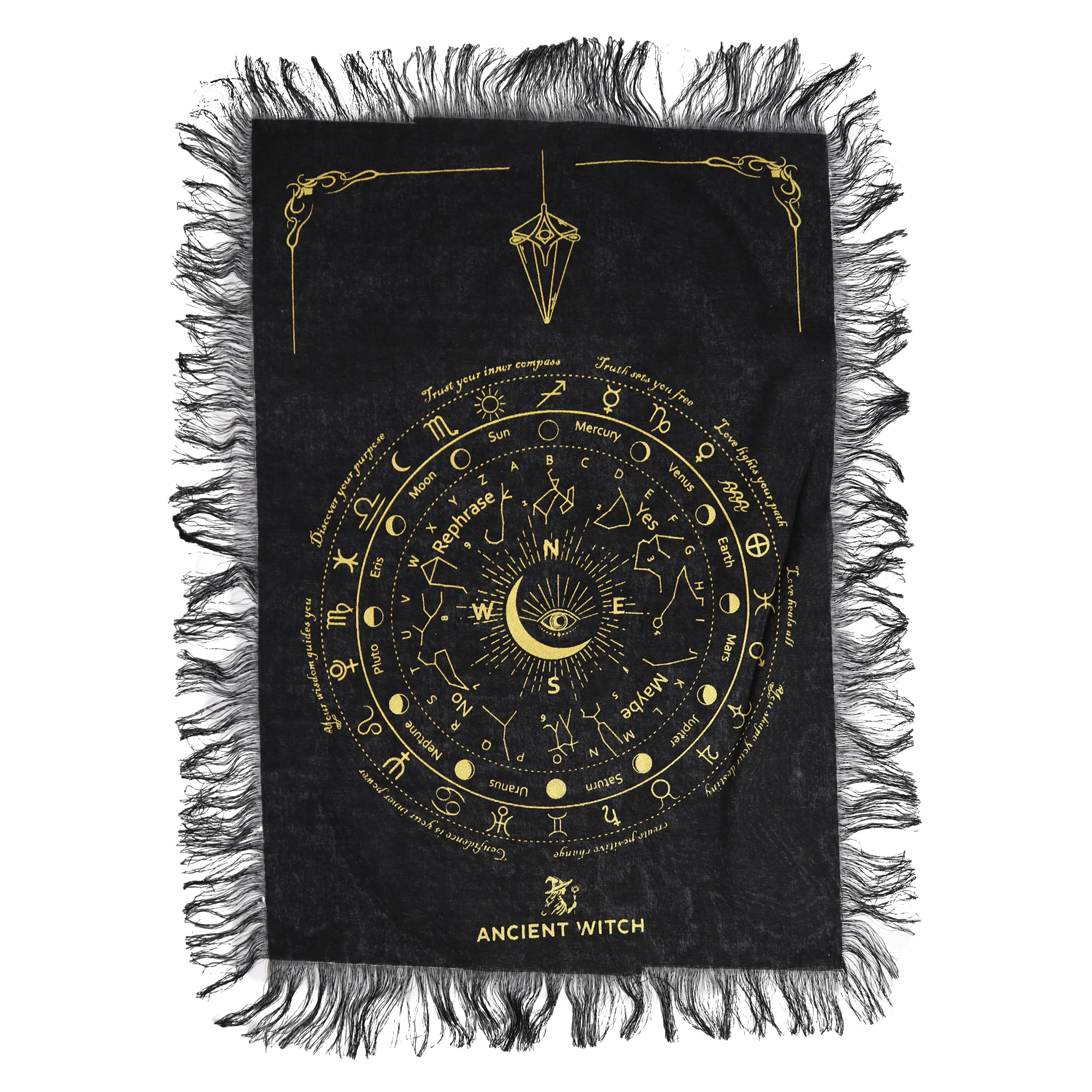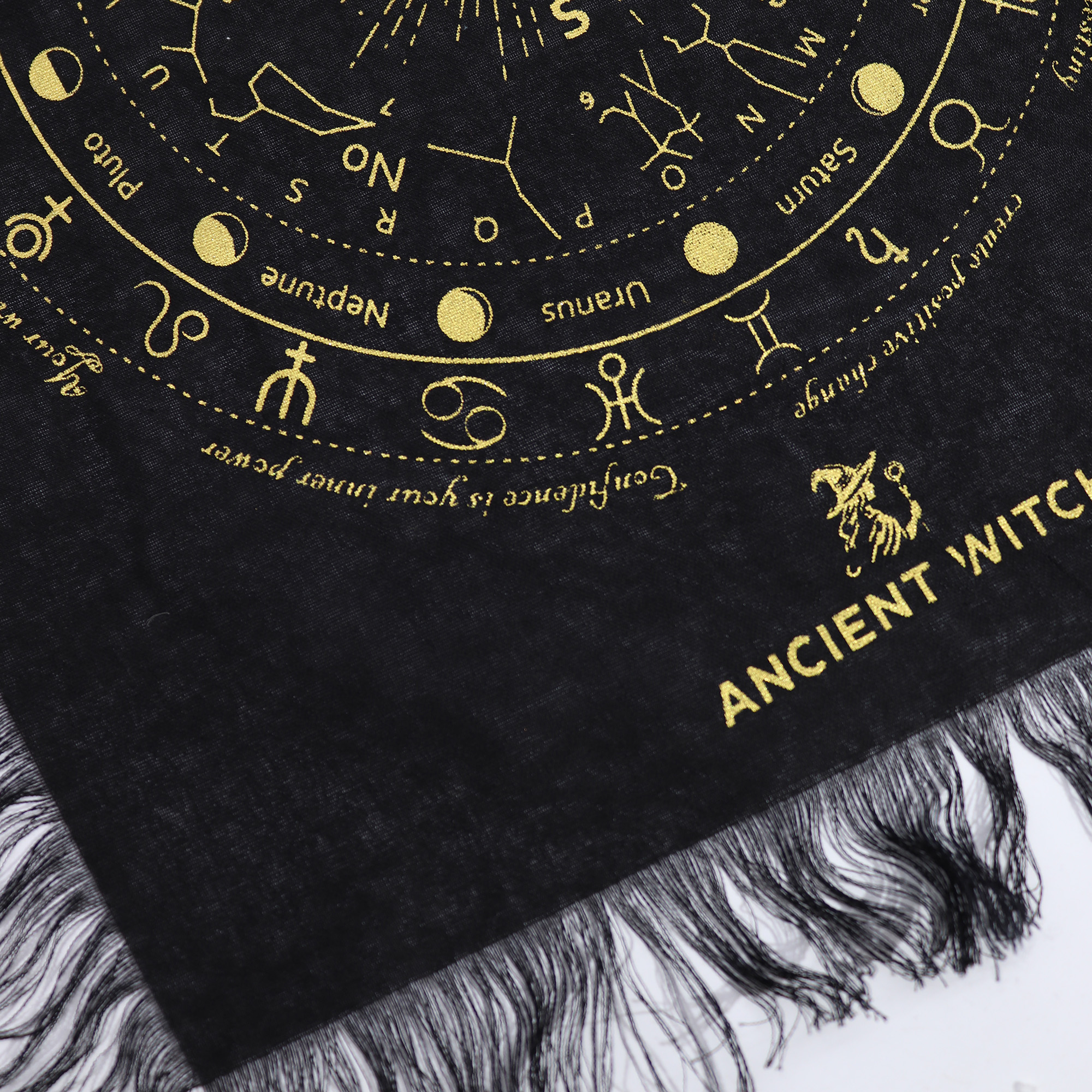 Prepracované kruhové rozloženie poskytuje jasne štruktúrovaný priestor na prácu s kyvadlom, tarotové výklady alebo aranžovanie kryštálov, čím pomáha vytvoriť sústredené a zámerné prostredie. Dekoratívne strapce po okrajoch dodávajú textúru a vizuálnu dynamiku, vďaka čomu podložka v predajni ešte viac vynikne.