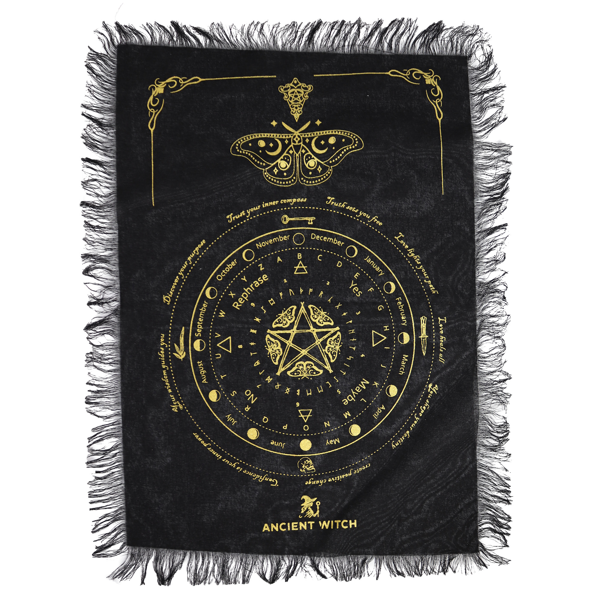 Výrazný a atmosférický dizajn Mystická moľa – čierno-zlatá prináša odvážny a prémiový vzhľad do každého ezoterického priestoru. Sýty čierny podklad v kombinácii s detailnou zlatou symbolickou potlačou vytvára silný kontrast, ktorý z nej robí pôsobivý stredobod pri práci s kyvadlom, tarotových výkladoch či rozložení kryštálov.