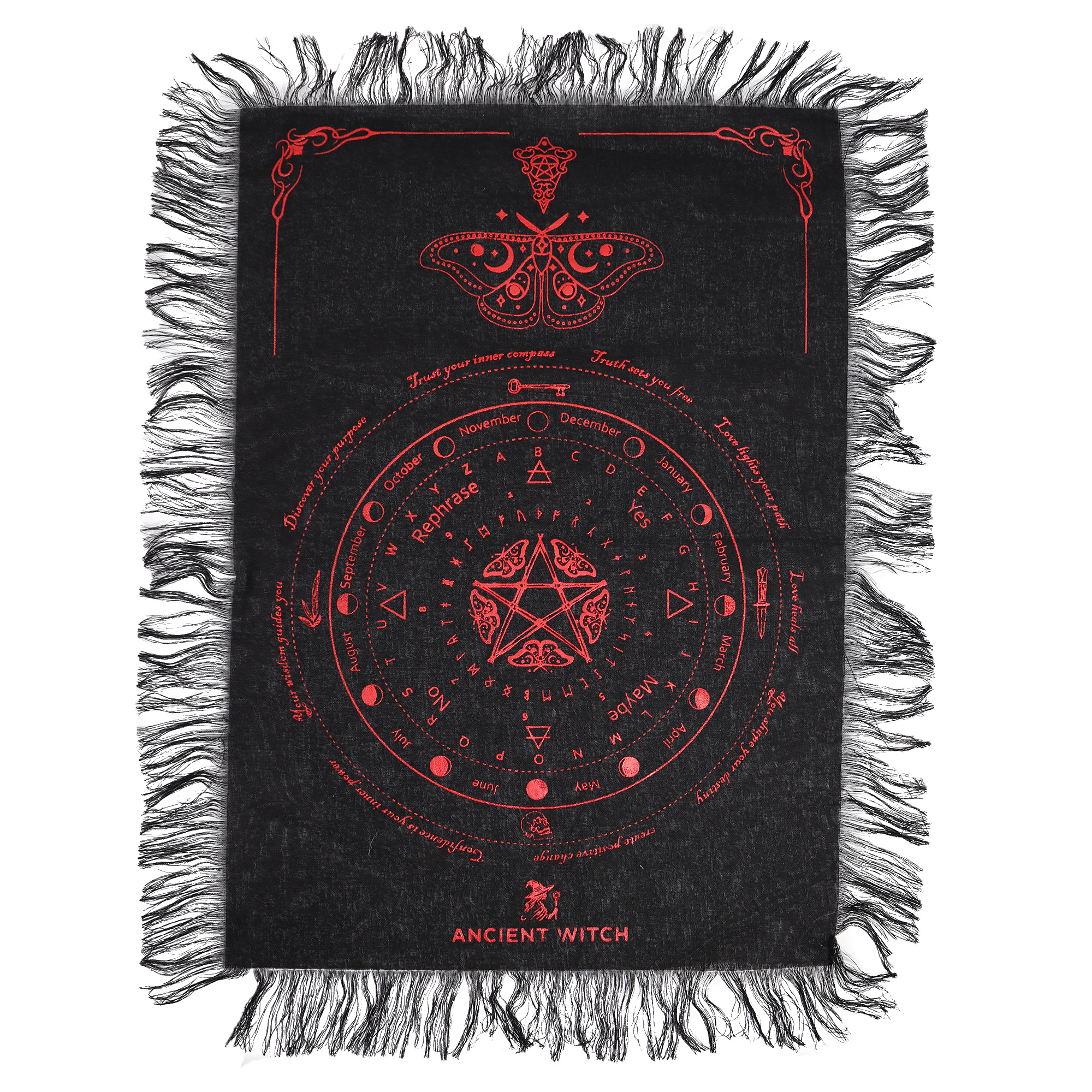 Náladový a výrazný dizajn Mystická moľa – čierno-bordová prináša silný vizuálny efekt. Živá bordová potlač ostro kontrastuje s tmavým podkladom a zvýrazňuje centrálny diagram aj symbolické detaily.