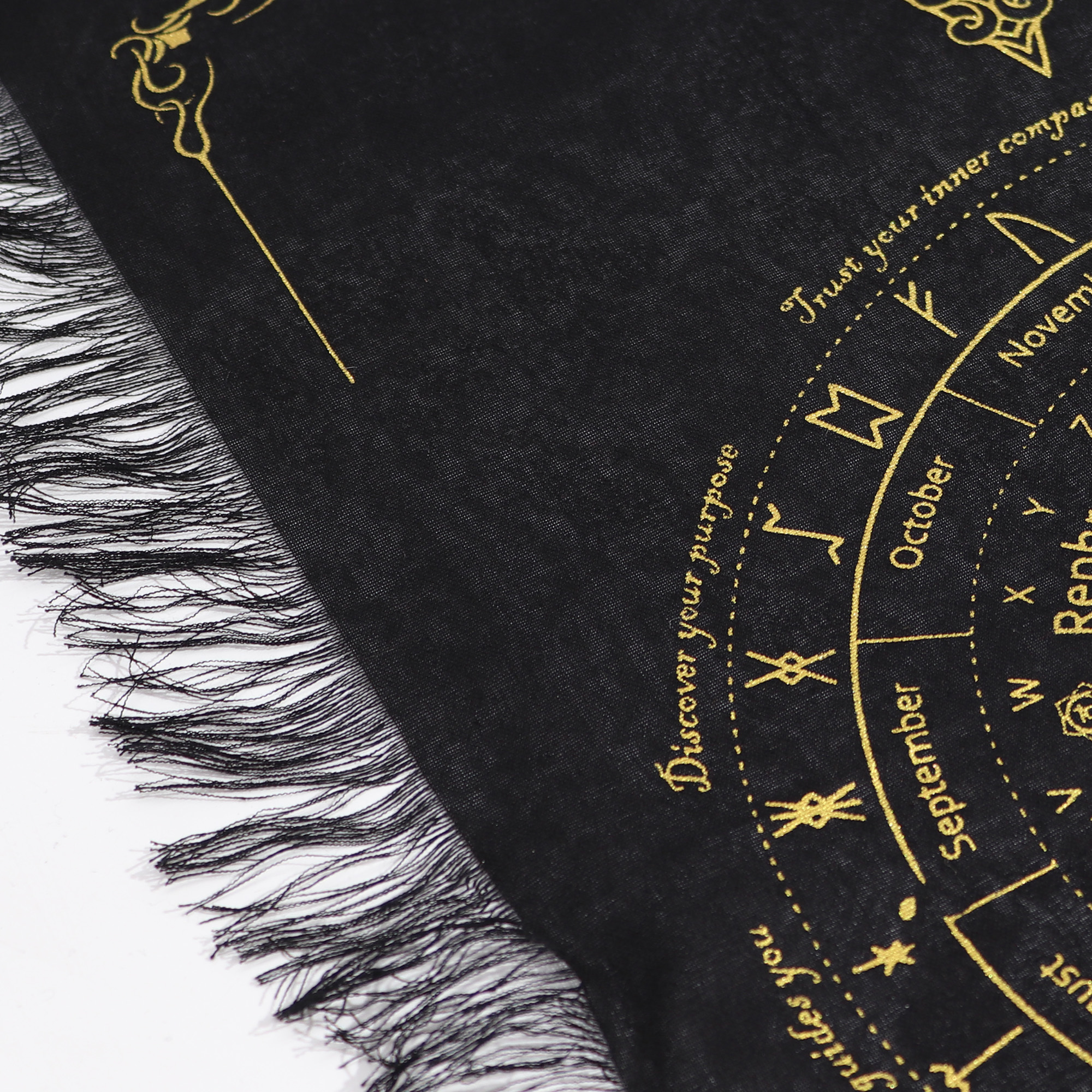 Vyrobená z bavlny, spája odolnosť s flexibilitou. Klasická kombinácia čiernej a zlatej sa prirodzene dopĺňa s mosadznými kyvadlami, zlatými detailmi a luxusnejšie ladenými mystickými kolekciami.