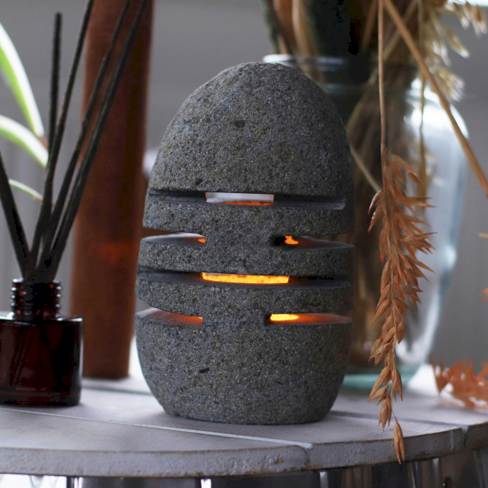 Je navrhnutý na umiestnenie klasickej čajovej sviečky a vytvára pokojný, uzemňujúci svetelný efekt, ktorý sa hodí do širokého spektra predajných aj obytných priestorov. Vyrezávaný dizajn stojaceho kameňa dodáva jemný vizuálny akcent, no zároveň umožňuje jednoduché kombinovanie s drevom, keramikou, textíliami a ďalšími prírodnými materiálmi.