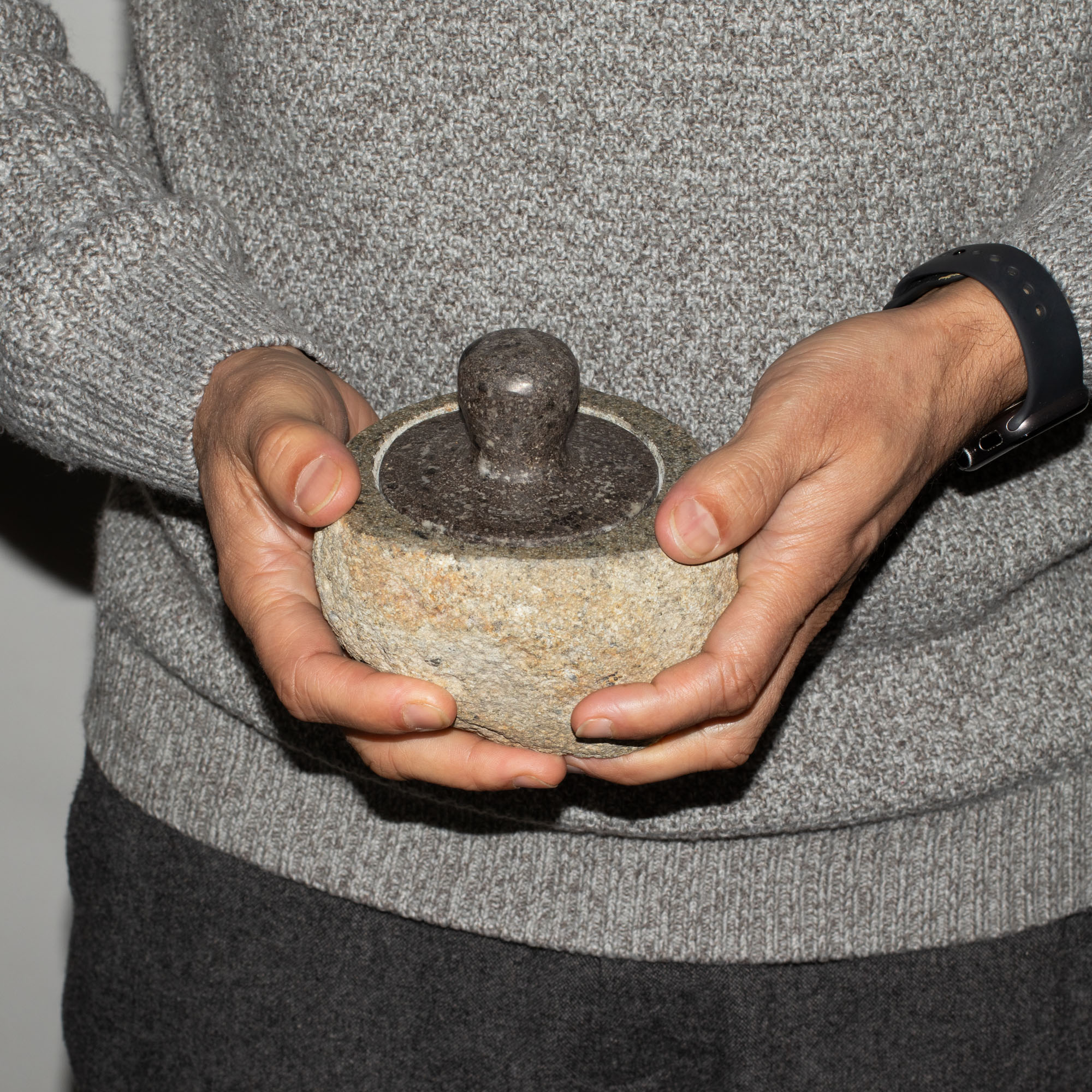 Táto stredne veľká uzemňujúca nádoba je vyrezaná z masívneho riečneho kameňa a zachováva si jeho prirodzenú váhu, textúru aj organický tvar. Vnútro je hladké, zatiaľ čo vonkajší povrch ostáva surový, vďaka čomu pôsobí príjemne v ruke a na každom povrchu vytvára tichý pocit stability.