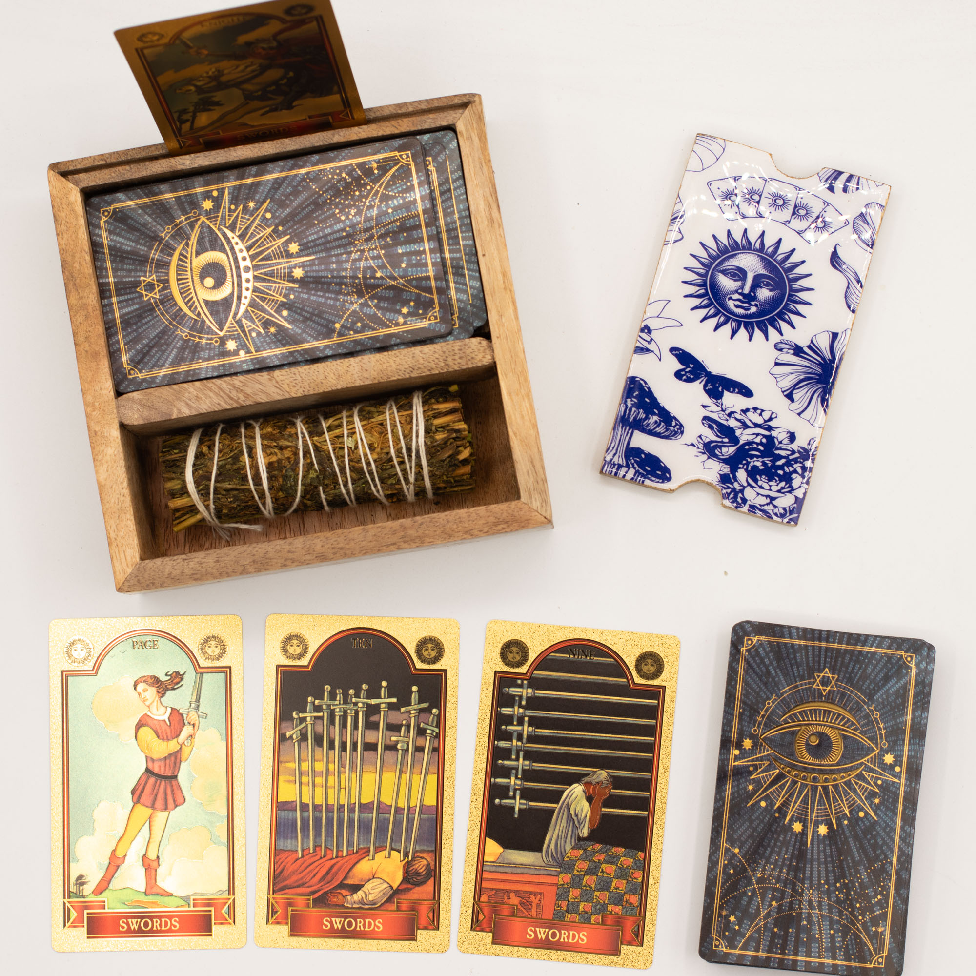 Táto krabička na tarotové karty je zakončená keramickým trojitým symbolom mesiaca, ktorý predstavuje intuíciu, cykly a duchovnú rovnováhu. Vnútri je priestor na tarotové balíčky a malé rituálne nástroje, zatiaľ čo zvislé vystavenie kariet umožňuje jasné zobrazenie vybraných kariet. Výborná voľba pre čitateľov, ktorých priťahuje lunárna symbolika a rituálne praktiky.