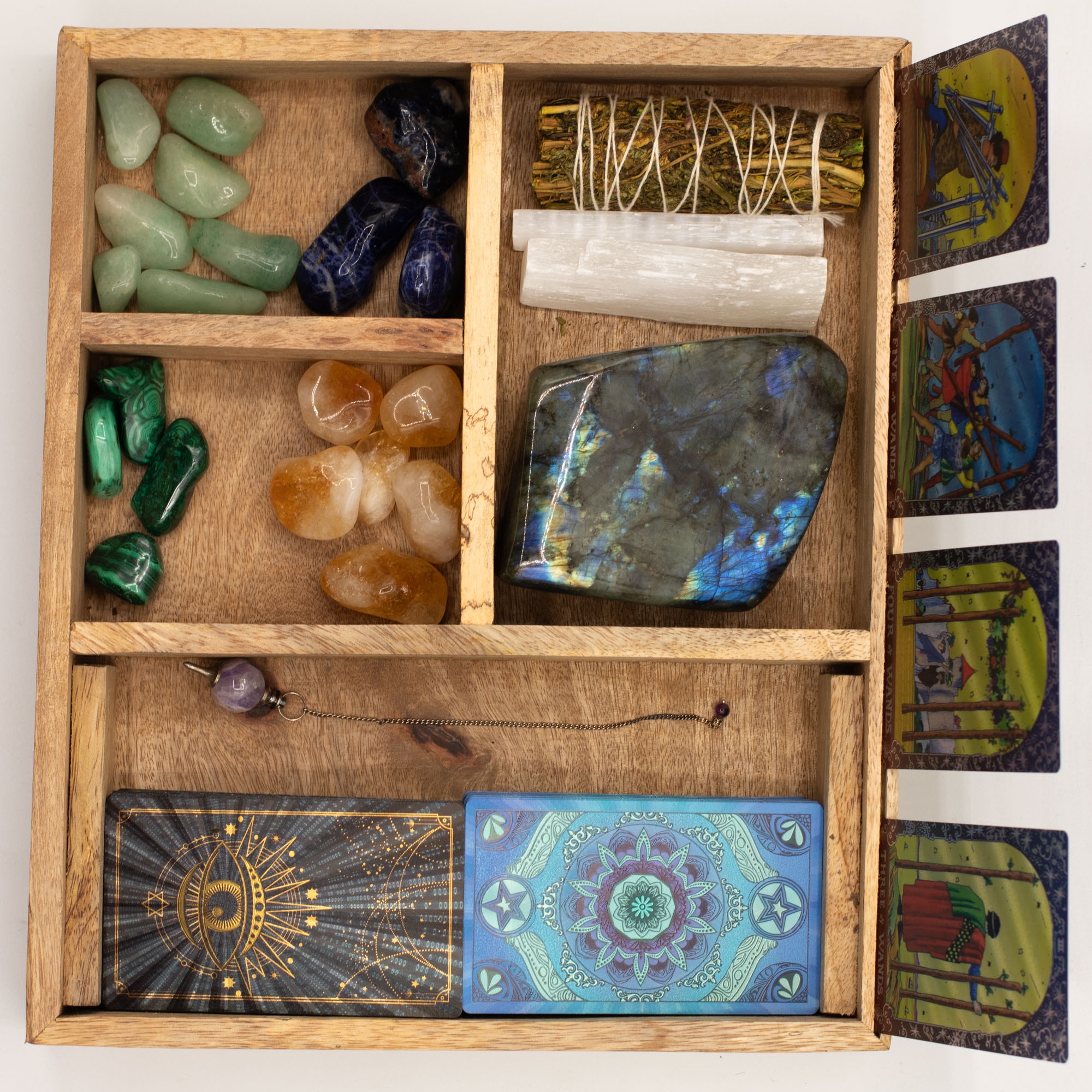Táto duchovne vyrytá tarotová škatuľka so širším formátom ponúka veľkorysý priestor, vďaka čomu je vhodná na uloženie viacerých balíčkov alebo väčších zbierok kryštálov. Zvislé vystavenie kariet umožňuje, aby vybrané karty zostali počas výkladu viditeľné, zatiaľ čo štruktúrovaný interiér udržiava všetko usporiadané a ľahko dostupné. Praktická voľba pre čitateľov, ktorí majú radi všetko usporiadané na jednom mieste.