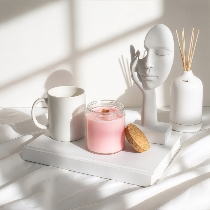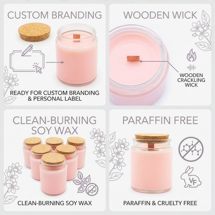 Obohaťte svoj sortiment o očarujúcu kvetinovú vôňu Jazmínová lúka. Táto sójová sviečka s dreveným knôtom bez etikety je navrhnutá pre predajcov, ktorí chcú ponúknuť sofistikovanú bytovú vôňu zachytávajúcu atmosféru pokojnej rozkvitnutej záhrady. Číra sklenená nádoba a prírodné korkové viečko vytvárajú minimalistický základ, vďaka ktorému vynikne vaša vlastná značka.