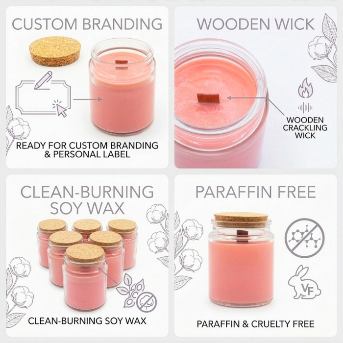 Obohaťte svoj sortiment bytových vôní o hlbokú a podmanivú vôňu Polnočná ruža. Táto sójová sviečka s dreveným knôtom bez etikety je vytvorená pre firmy, ktoré hľadajú sofistikovaný produkt pripravený na vlastný branding, spájajúci klasické kvetinové tóny s moderným, tajomným nádychom. Bohatá farba vosku krásne vyniká v čírej sklenenej nádobe a vytvára elegantný základ pre vašu značku.