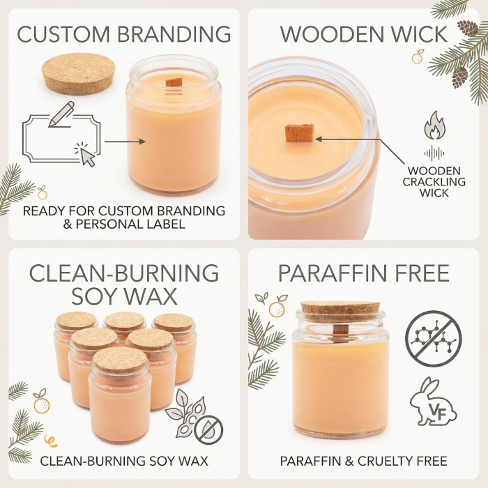 Osviežte svoj sortiment o energickú a zároveň uzemňujúcu vôňu Lesná sviežosť. Táto sójová sviečka s dreveným knôtom bez etikety je ideálnou voľbou pre firmy, ktoré chcú ponúknuť vôňu spájajúcu sviežu citrusovú energiu s hlbokými lesnými tónmi. Čistý dizajn čírej sklenenej nádoby a prírodného korkového viečka necháva vyniknúť vašu vlastnú značku.