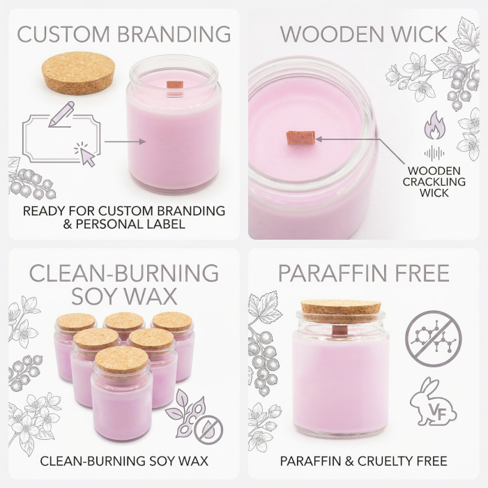 Prineste do svojej značky nádych tajomstva a nočného pokoja so sójovou sviečkou s dreveným knôtom Vlčí mesiac. Táto sviečka bez etikety je vytvorená pre predajcov, ktorí chcú ponúknuť atmosférickú a zároveň uzemňujúcu vôňu, zachytávajúcu chladnú a tichú esenciu lesa pod splnom. Minimalistická číra sklenená nádoba a prírodné korkové viečko poskytujú čistý, moderný základ pre vašu značku.