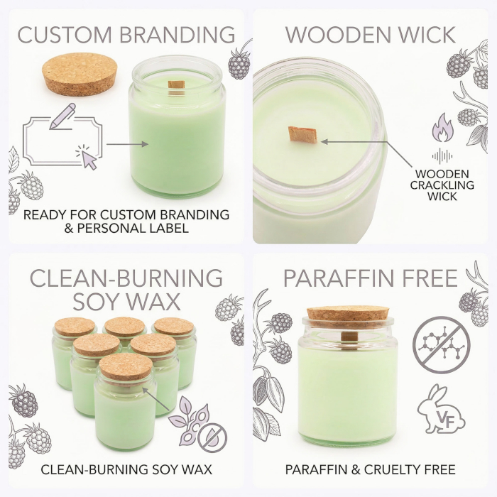 Dodajte svojej značke nádych večerného pokoja s očarujúcou vôňou Súmračná liana. Táto sójová sviečka s dreveným knôtom bez etikety je navrhnutá pre predajcov, ktorí hľadajú vôňu zachytávajúcu sviežu botanickú atmosféru záhrady za súmraku. Číra sklenená nádoba a prírodné korkové viečko vytvárajú čistý, moderný vzhľad, vďaka ktorému vynikne vaša značka.