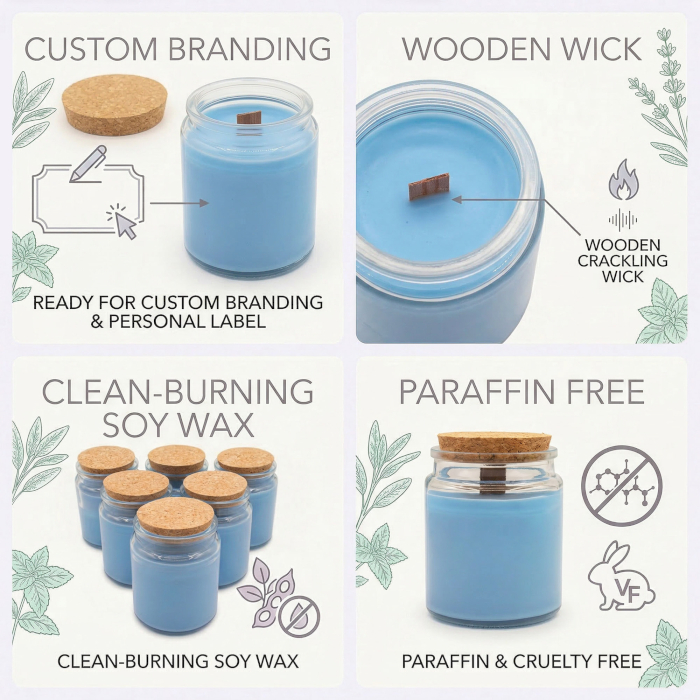 Osviežte svoj sortiment vôní o čistú a bylinnú arómu Šalvia a mäta (drevitá vôňa). Táto sójová sviečka s dreveným knôtom bez etikety je navrhnutá pre predajcov, ktorí hľadajú vôňu spájajúcu uzemňujúce zemité tóny s osviežujúcou botanickou sviežosťou. Číra sklenená nádoba a prírodné korkové viečko vytvárajú moderný a elegantný základ pre vašu značku.