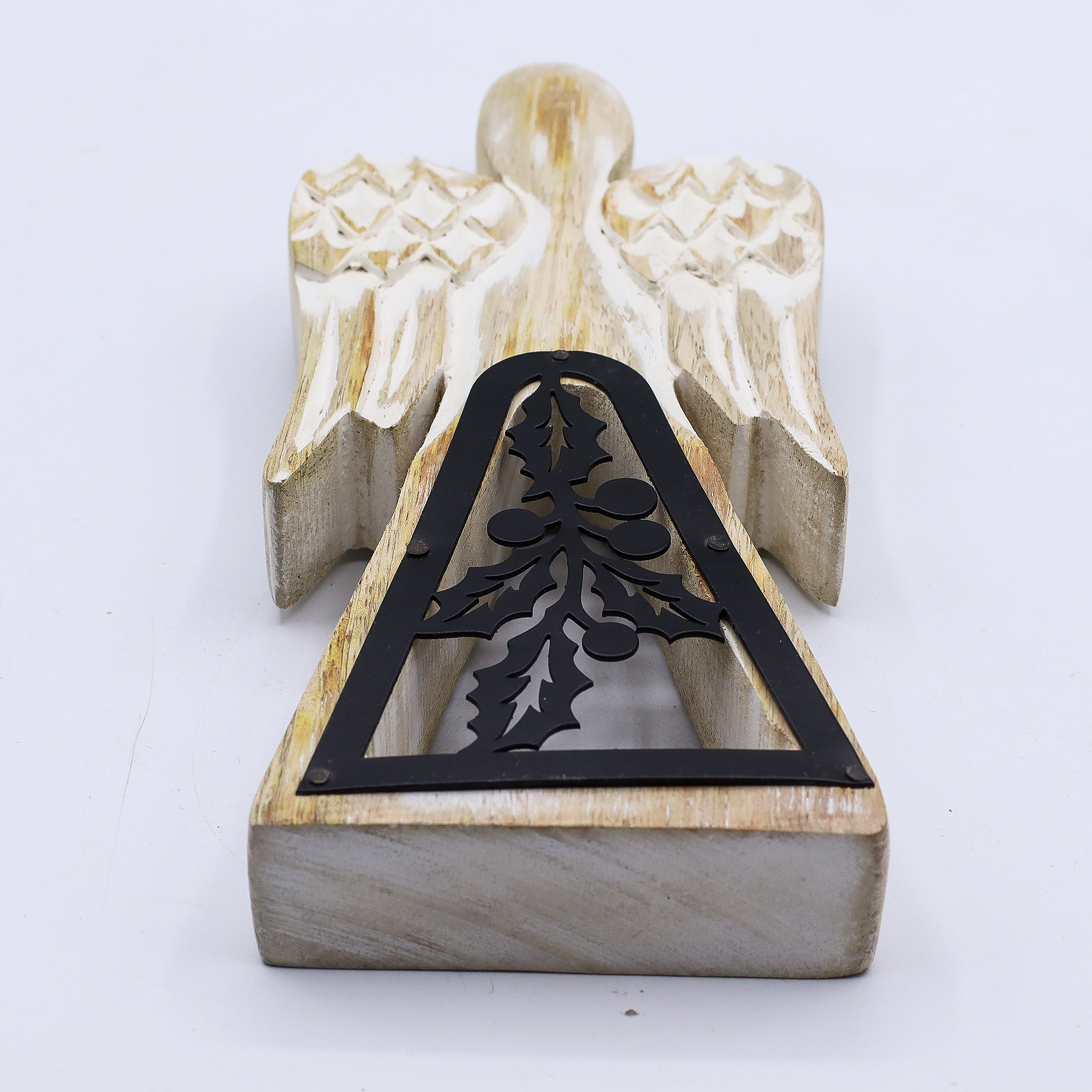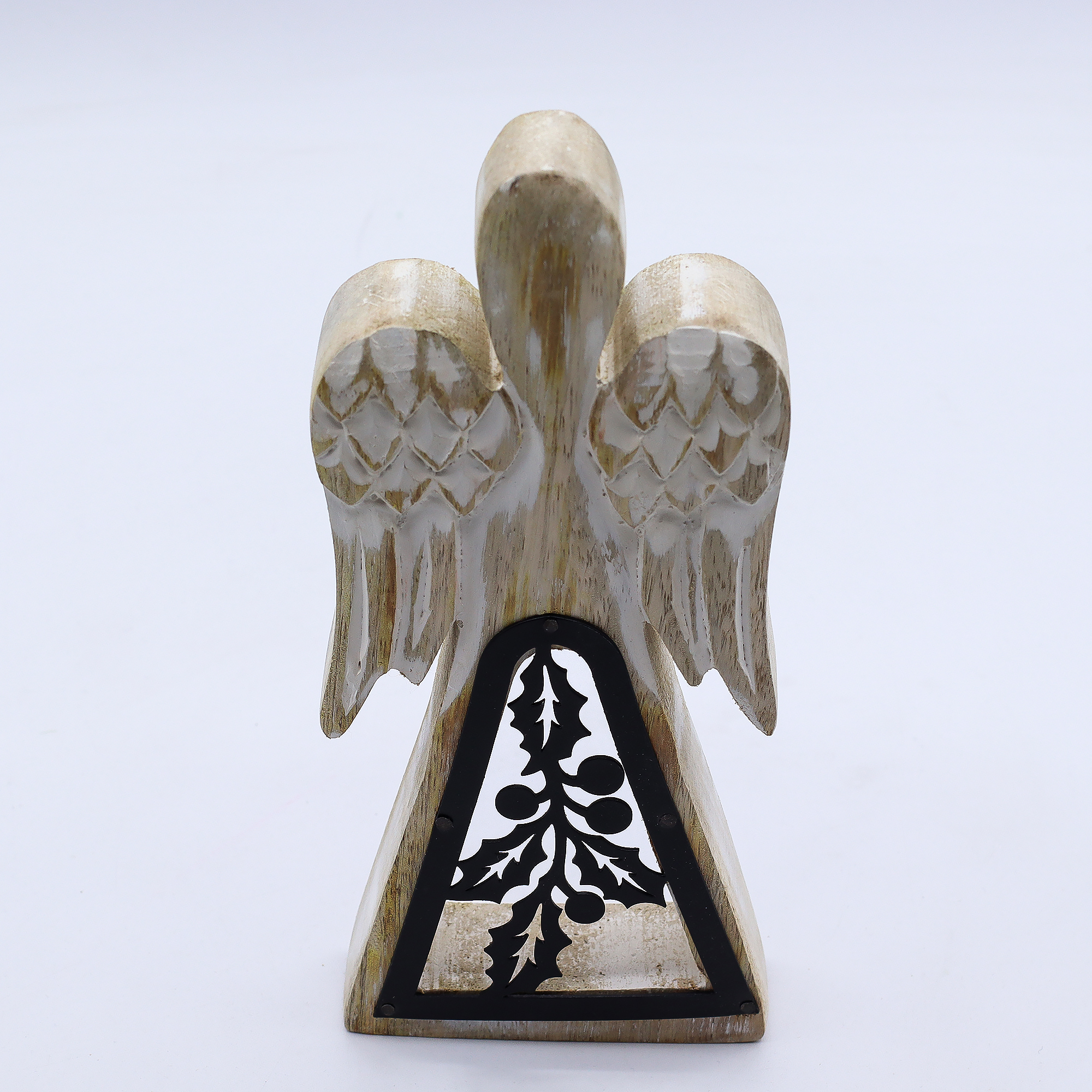 Drevený anjel z mangového dreva – bielený efekt s kovovým výrezom, 18 cm