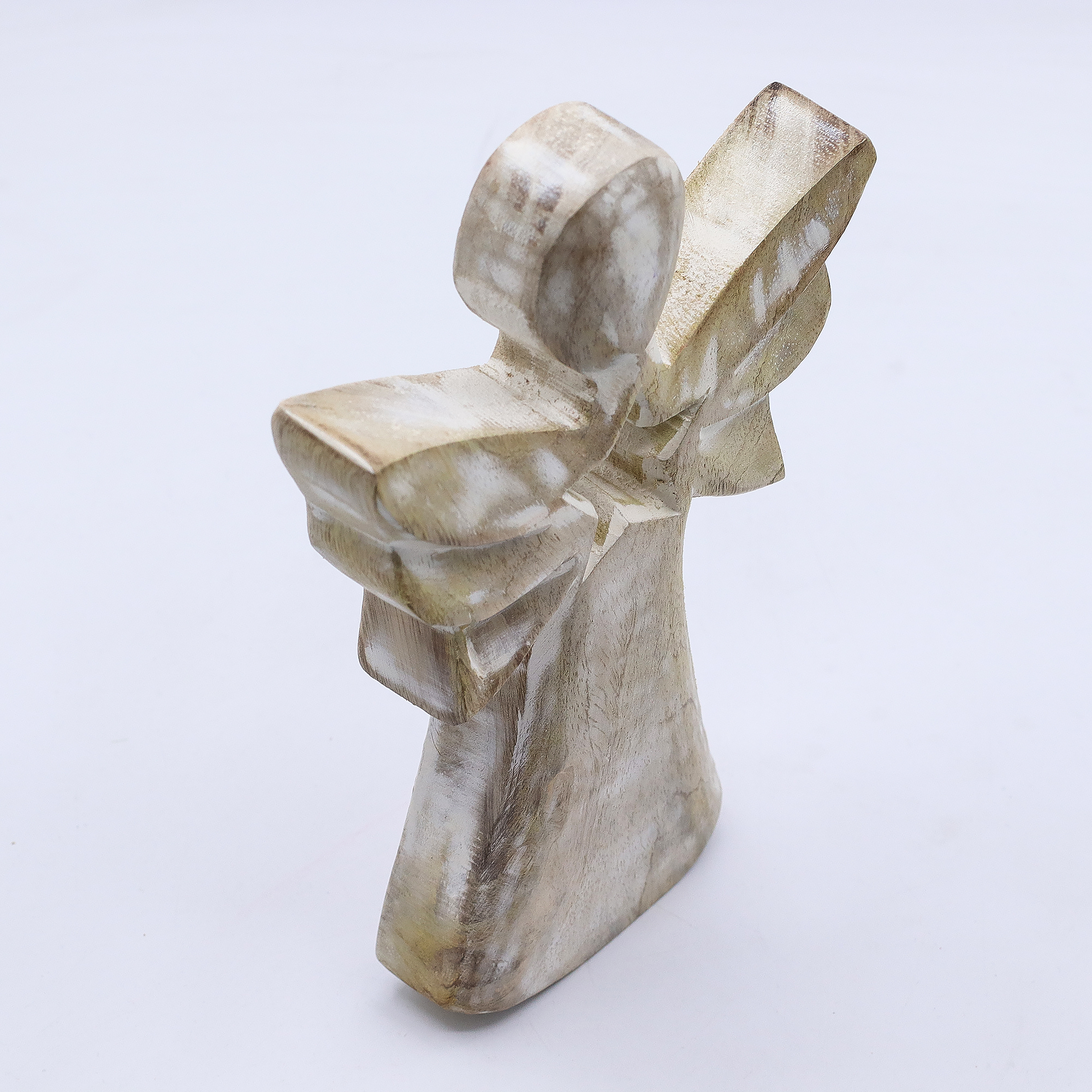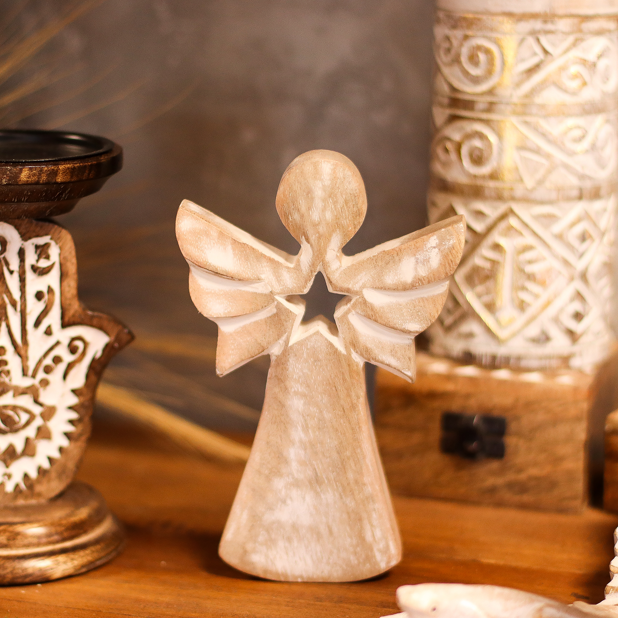 Drevený anjel z mangového dreva – bielený efekt s výrezom hviezdy, 18 cm