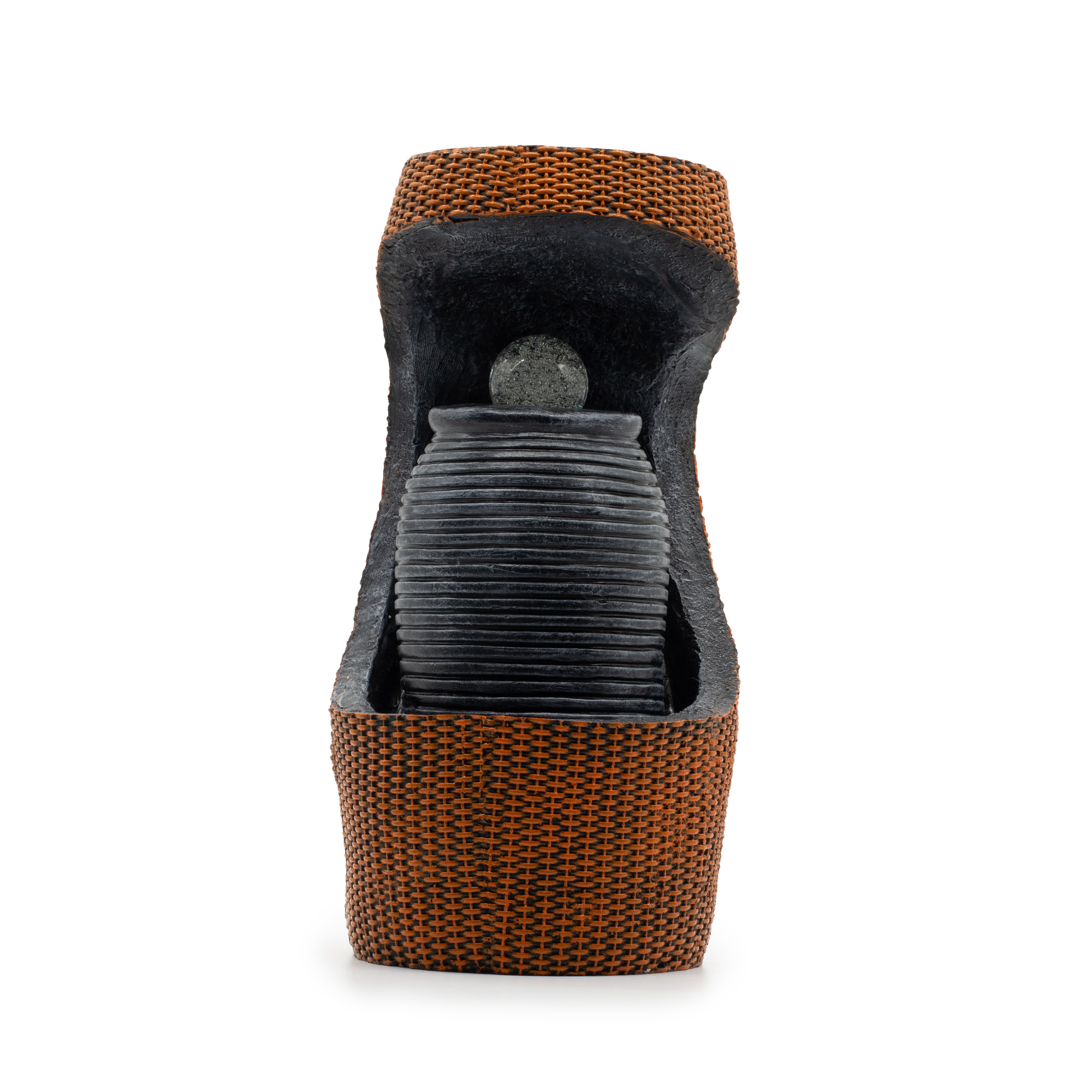 Voda jemne steká po povrchu urny smerom ku krištáľovej guli umiestnenej v hornej časti, kde ju zvýrazňuje LED osvetlenie s plynulo sa meniacimi farbami. Svetlo sa mäkko odráža v pohybujúcej sa vode a spolu s tmavými kamennými tónmi a teplým pleteným detailom vytvára vizuálne bohatý, no vyvážený celok.