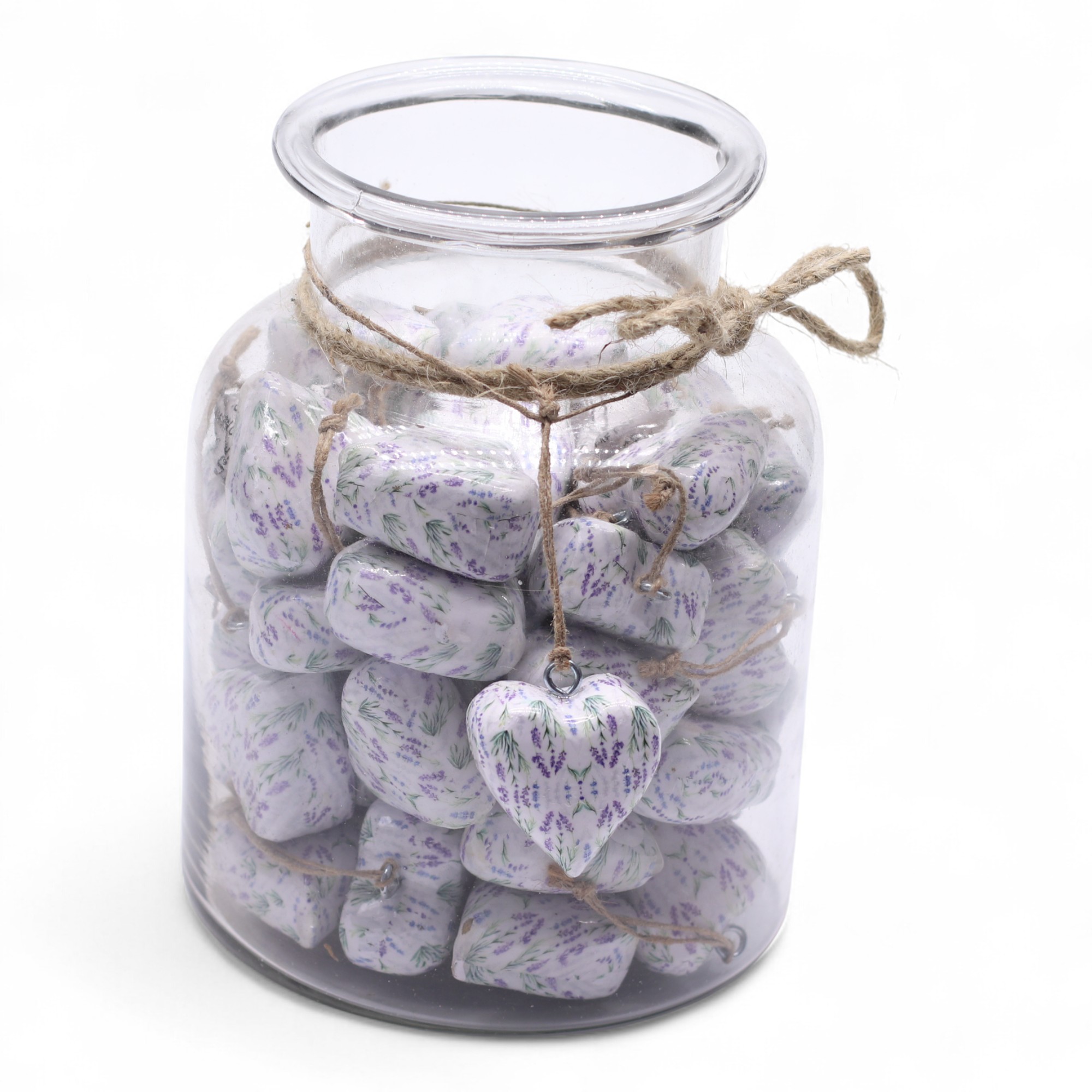 Vneste do svojej sezónnej ponuky upokojujúci, elegantný nádych s týmto prezentačným pohárom obsahujúcim približne 50 veľkých drevených srdiečok s levanduľovým dekorom. Každé srdiečko nesie jemný motív levandule, ideálny na vianočnú výzdobu, milé darčeky alebo na dodanie upokojujúceho akcentu akémukoľvek interiéru.
