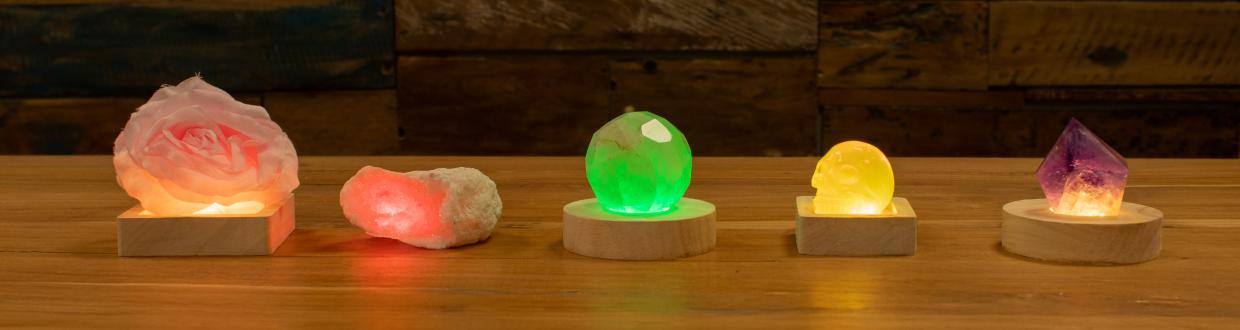Sú dostupné v rôznych veľkostiach a tvaroch, takže sú vhodné pre malé drahokamové hroty aj väčšie výrazné dekoračné predmety. Na výber je studené biele LED svetlo pre jasnú a čistú žiaru, teplé biele LED svetlo pre jemnejšiu atmosféru alebo viacfarebné LED svetlo s efektom meniacej sa farby. Napájanie je zabezpečené cez USB, čo umožňuje jednoduché použitie v predajniach, na výstavách aj v domácnosti.